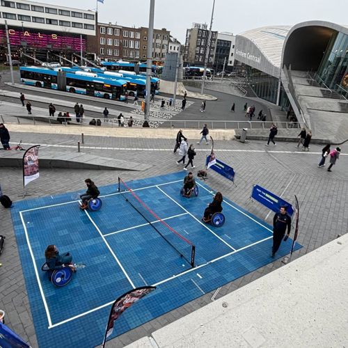 Debets vond het mooi om zelf eens te ervaren hoe dat nou is, tennis in een rolstoel. Die mening deelde hij met vele voorbijgangers, die interesse toonden in het spel en zelfs een trein later pakten om het zelf te ervaren.