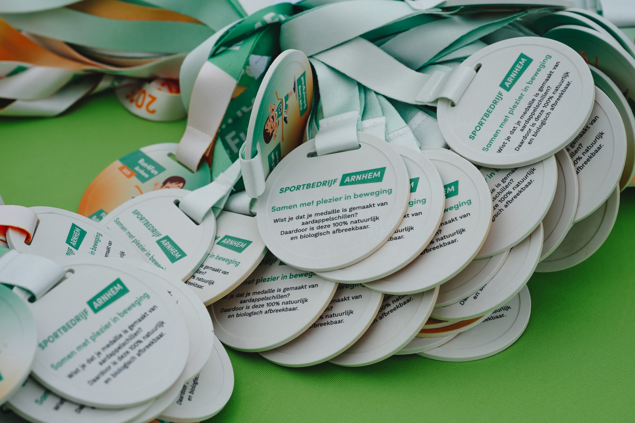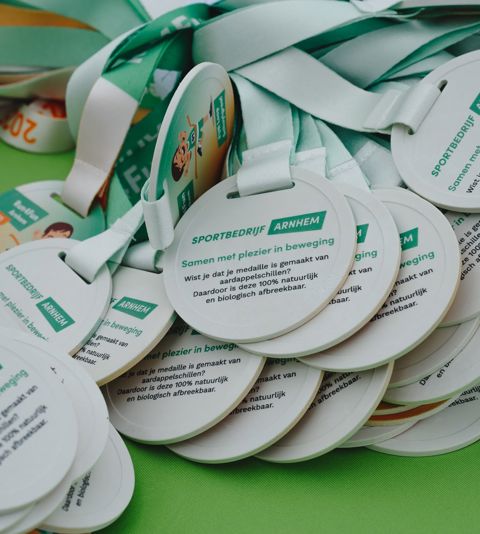 Bij sportevenementen reiken we geen plastic medailles uit, maar biologisch afbreekbare medailles gemaakt van aardappelzetmeel. Zo vieren we prestaties op een duurzame manier!